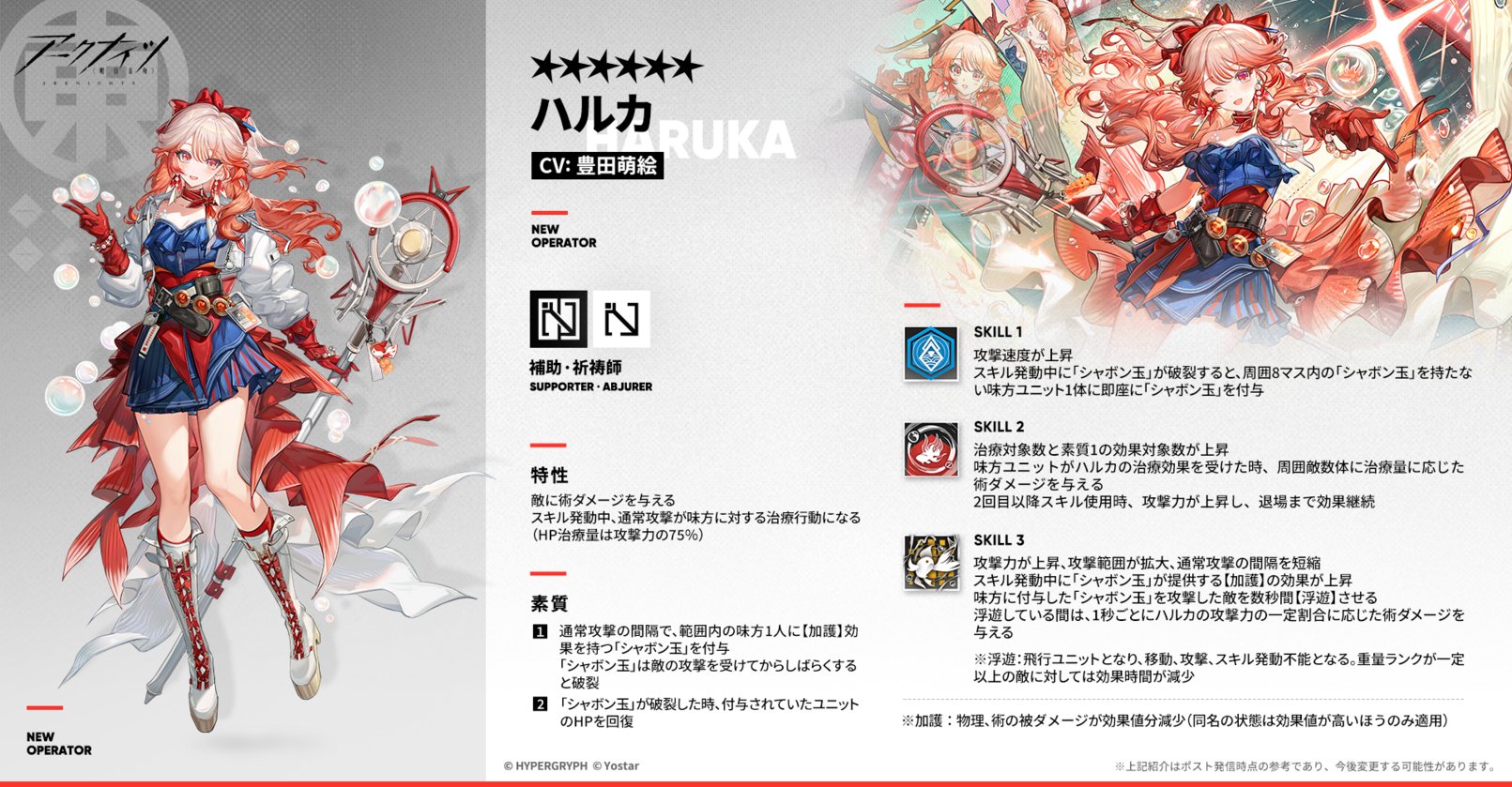 スキル発動中に「シャボン玉」が提供する 【加護】の効果が上昇 味方に付与した「シャボン玉」を攻撃した敵を数秒間 【浮遊】させる 浮遊している間は、1秒ごとにハルカの攻撃力の一定割合に応じた術ダメージを与える |