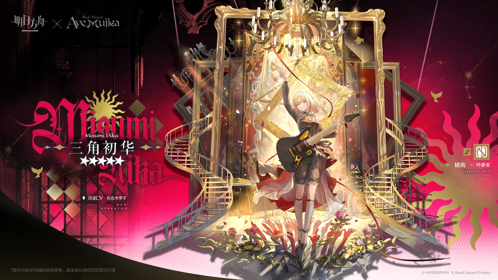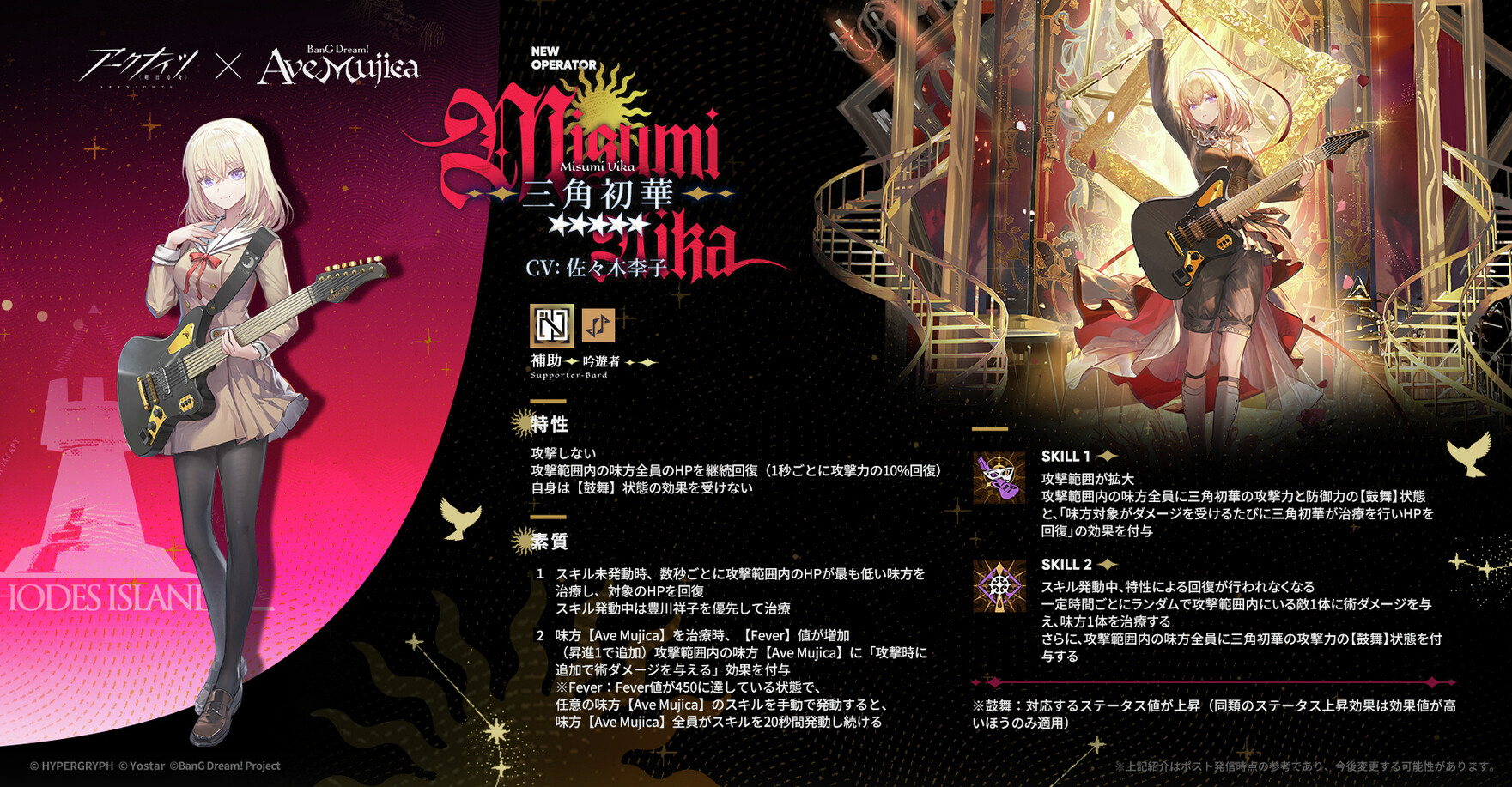 一定時間ごとにランダムで攻撃範囲内にいる敵1体にダメージを与え、味方1体を治療する さらに、攻撃範囲内の味方全員に三角初華の攻撃力の【鼓舞】状態を付与する |