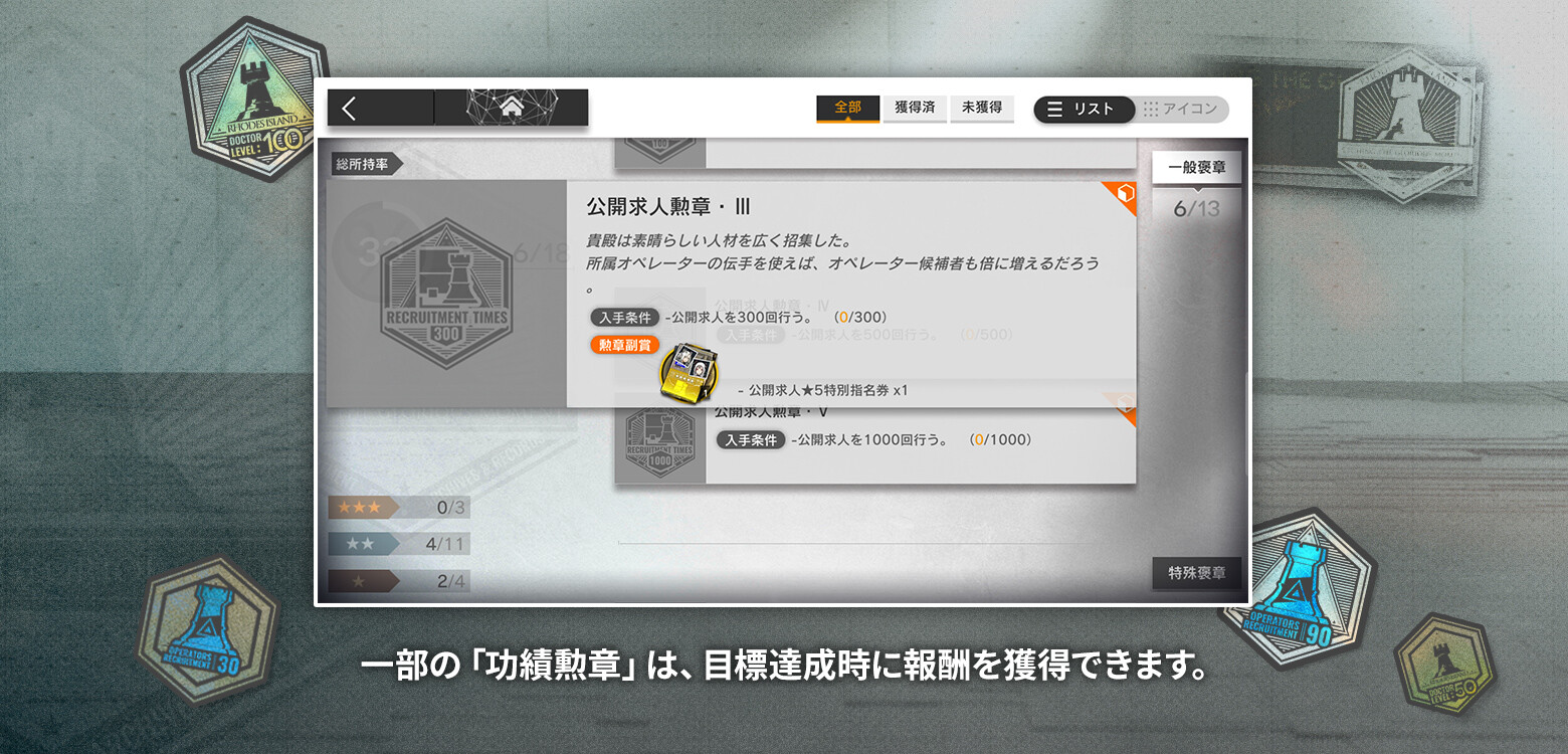 一定の条件を達成することで、プロファイルで飾ることができる「功績勲章」を獲得できます。