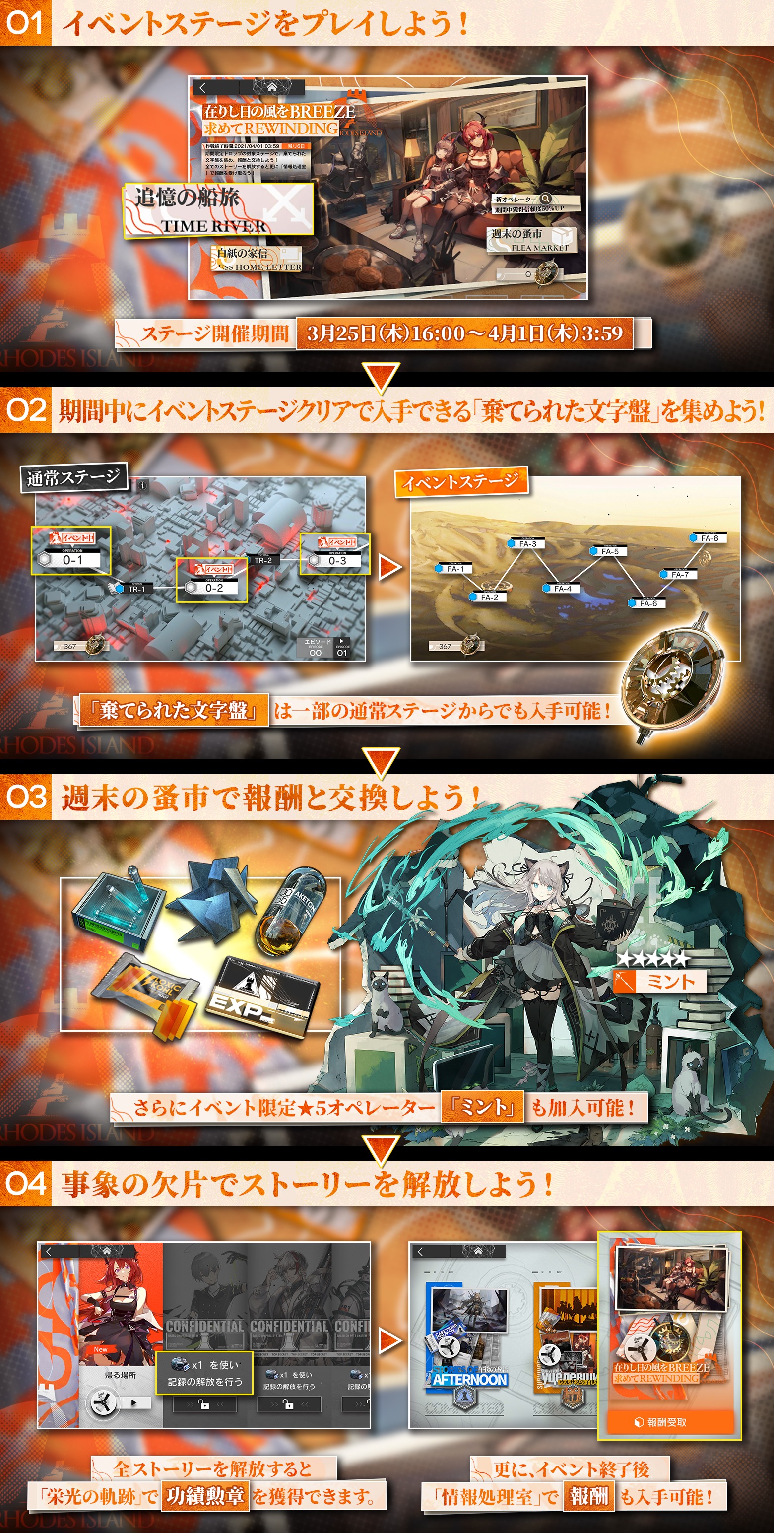 「棄てられた文字盤」を一定数集めることで、イベント限定オペレーター「ミント」が加入します。 また、収集数に応じて素材などの報酬も入手できます。